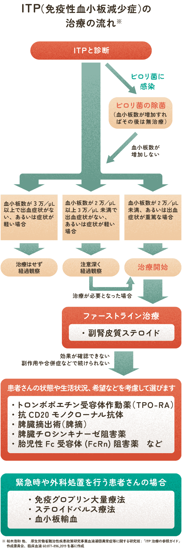 - 1)柏木浩和 ほか(厚生労働省難治性疾患政策研究事業 血液凝固異常症等に関する研究班「ITP治療の参照ガイド」作成委員会).成人特発性血小板減少性紫斑病治療の参照ガイド 2019改訂版.臨床血液60(8):877-896,2019
